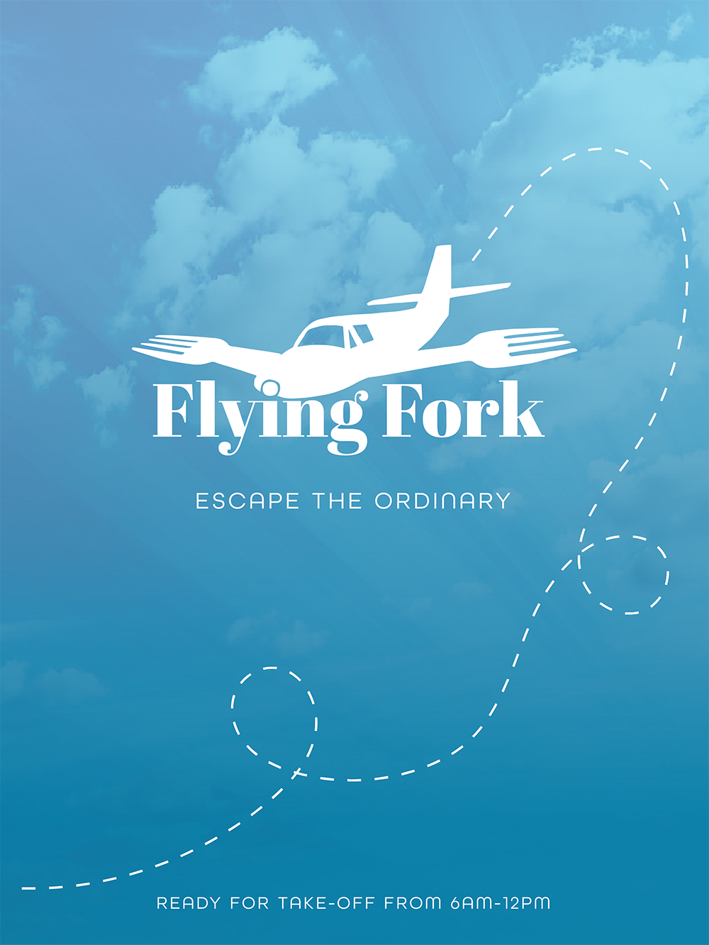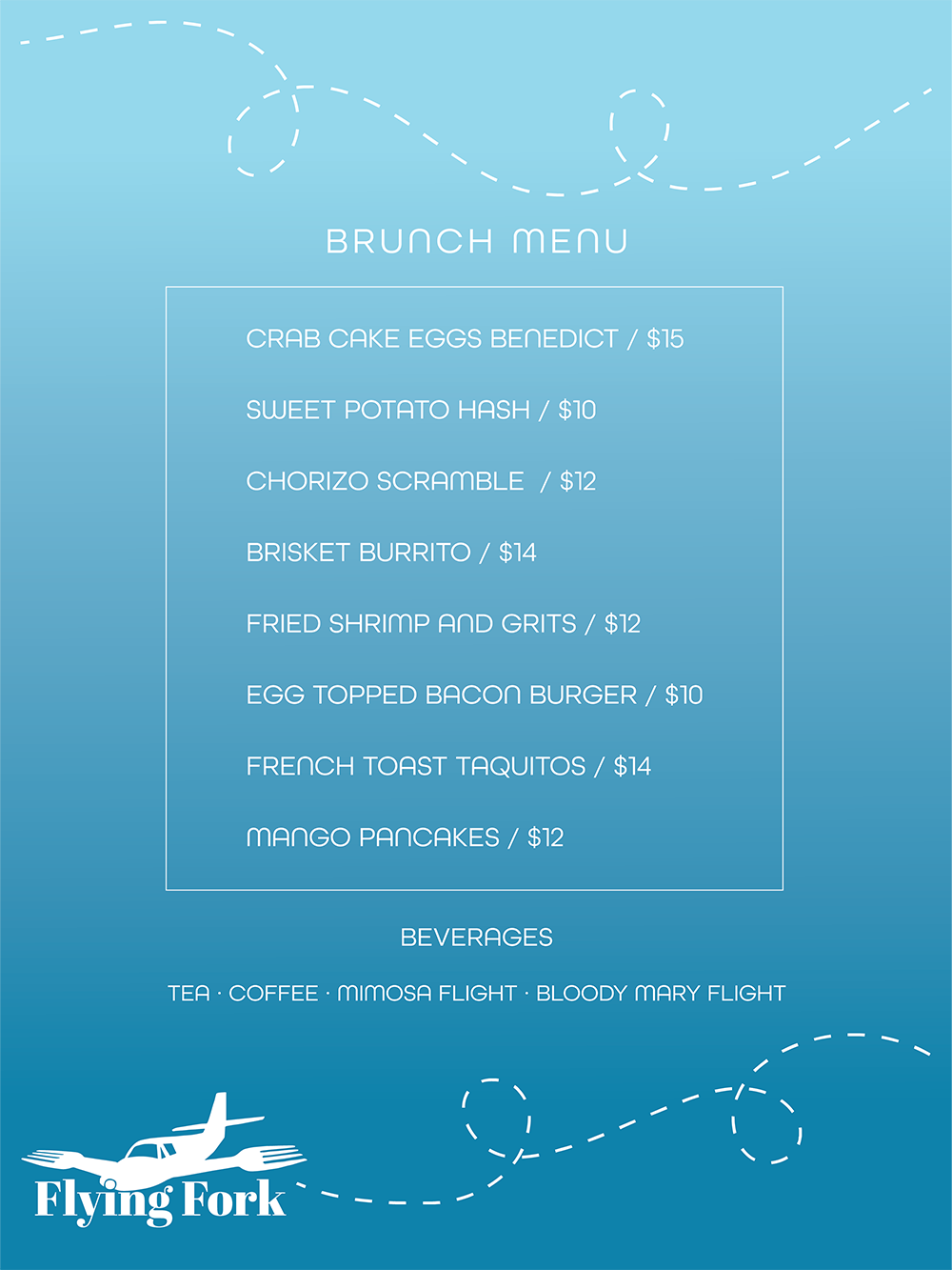 A menu for The Flying Fork. My task was to take a preexisting logo and incorporate it into my design. I tweaked the logo because I did not like the original font and went with a simple brunch menu.
